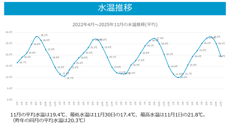 11月の平均水温は19.4℃、最低水温は11月30日の17.4℃、最高水温は11月1日の21.8℃。