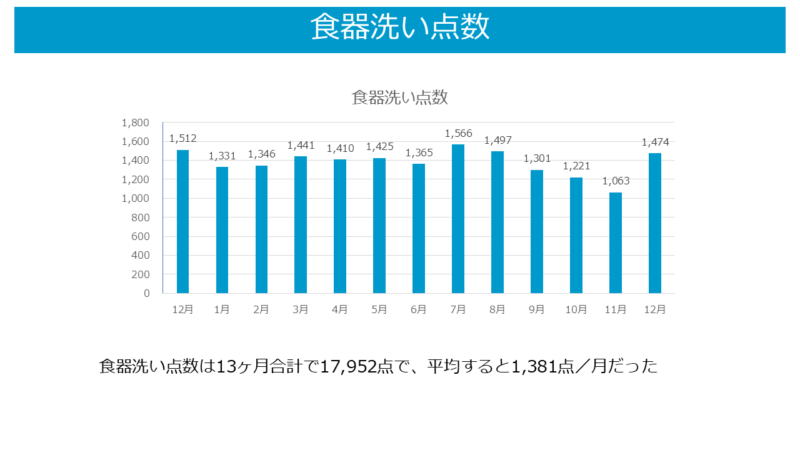 1カ月で記録したのは、洗い物の時間、洗い物の数(点数)と洗剤使用量です。
