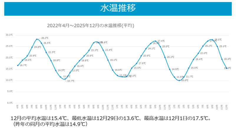12月の平均水温は15.4℃、最低水温は12月29日の13.6℃、最高水温は12月1日の17.5℃。