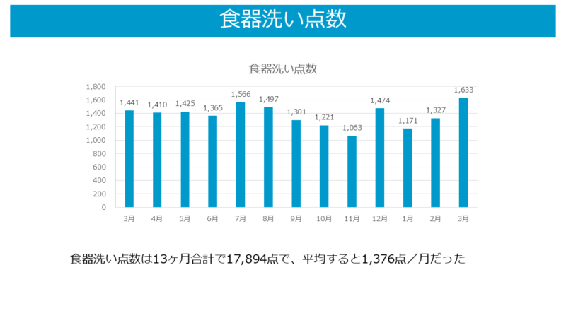 1カ月で記録したのは、洗い物の時間、洗い物の数(点数)と洗剤使用量です。